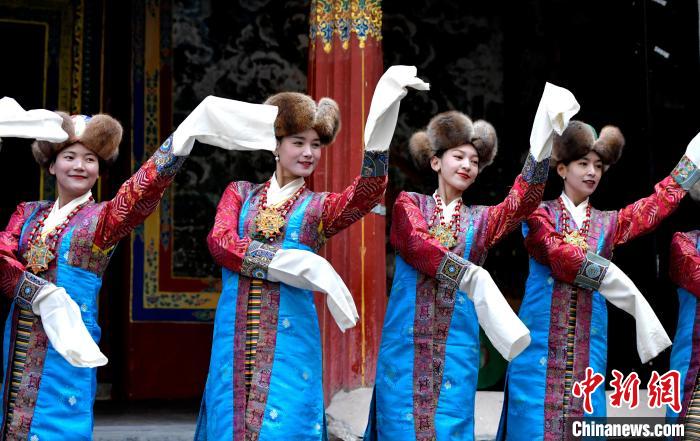 據(jù)悉,堆諧最早流傳于日喀則,是由扎念琴樂器伴奏的舞蹈。扎念琴是堆諧“邊彈、邊唱、邊舞”表演風(fēng)格形成的關(guān)鍵。作為日喀則市桑珠孜區(qū)的重要非遺項(xiàng)目之一,堆諧以其獨(dú)特的表演形式,受到了眾多觀眾的喜愛。日喀則市諧欽則起源于1883年,其韻調(diào)古樸,表現(xiàn)獨(dú)特,顯示出濃郁的西藏風(fēng)景和鮮明的地方特色。諧欽演員們精湛的表演技藝、華麗的戲服,將古老的西藏歌舞藝術(shù)完美呈現(xiàn)在這座古建筑前。