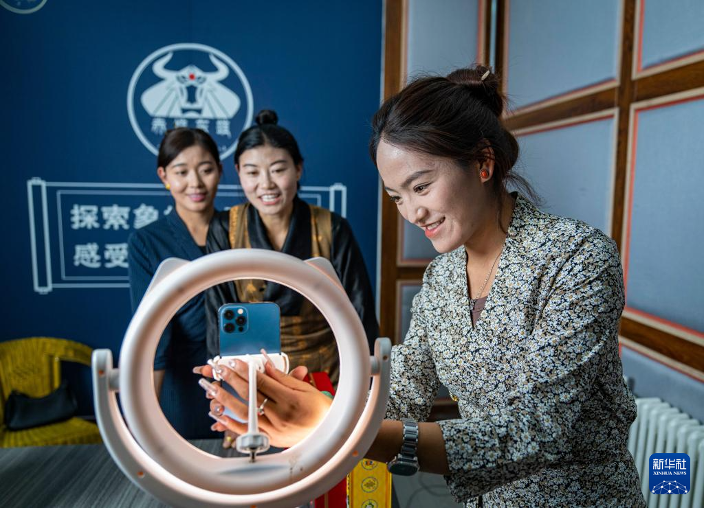 主播朗貢旺姆在巴青縣“赤堆東雄”網(wǎng)紅直播間調試直播設備(10月29日攝)。新華社記者 孫非 攝