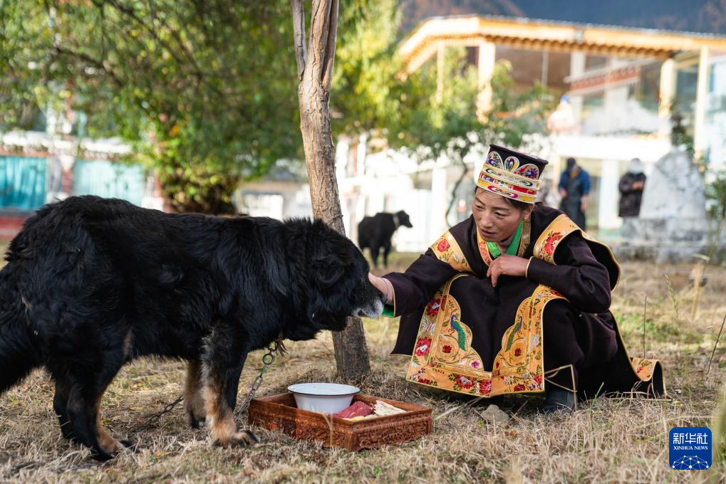 工布新年的大年初一,拉巴卓瑪按照習(xí)俗“請(qǐng)狗赴宴”,為家里的狗端來了新鮮牛肉、糌粑和牛奶(11月14日攝)。新華社記者 丁增尼達(dá) 攝