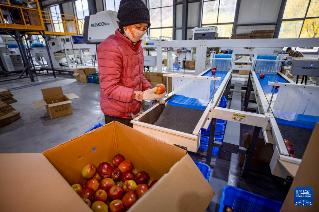 米林市羌納鄉(xiāng)西藏林芝現(xiàn)代蘋果標(biāo)準(zhǔn)化園區(qū)分揀車間內(nèi),工人在流水線上分揀蘋果(11月13日攝)。新華社記者 姜帆 攝