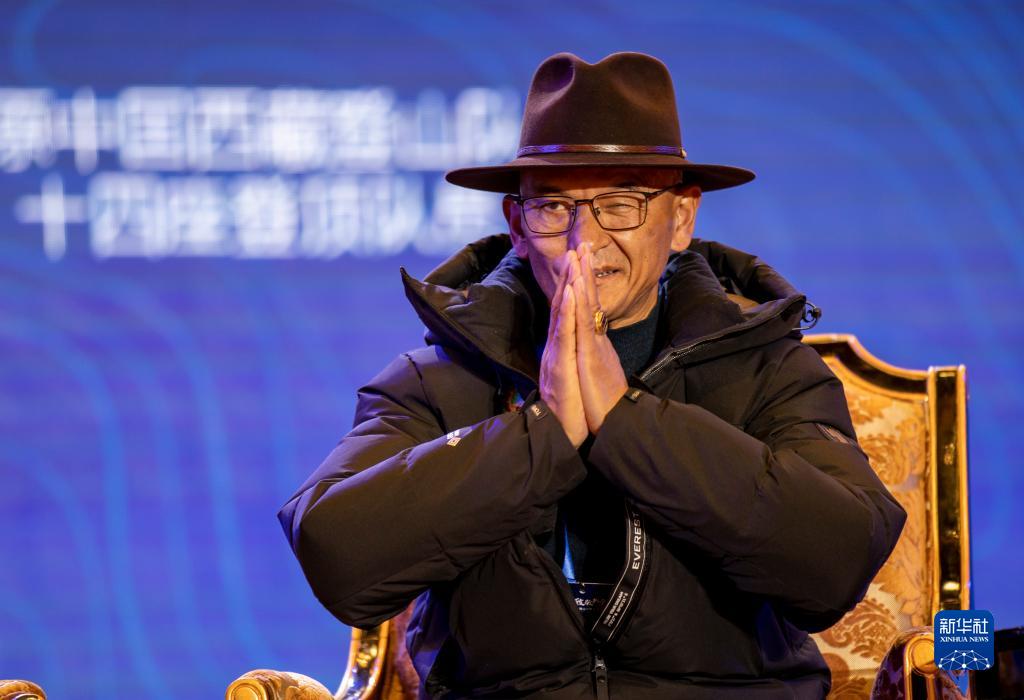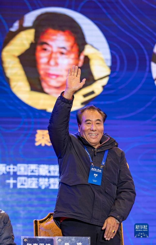 12月11日,原西藏登山隊(duì)登頂世界十四座海拔8000米以上高峰探險(xiǎn)隊(duì)隊(duì)長(zhǎng)桑珠在交流大會(huì)上向觀(guān)眾致意。新華社記者 姜帆 攝