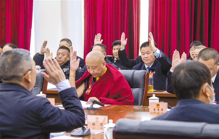 圖為日喀則市第二屆人民代表大會(huì)第四次會(huì)議主席團(tuán)第一次會(huì)議主席團(tuán)成員舉手表決。