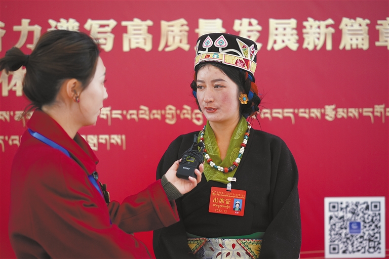 圖為人大代表尼珍接受媒體采訪。