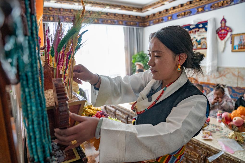 1月8日,愛心媽媽旦增卓瑪在擺放切瑪(五谷斗)。新華社照片,拉薩,2024年1月9日 新華社發(fā)(丁增尼達攝)