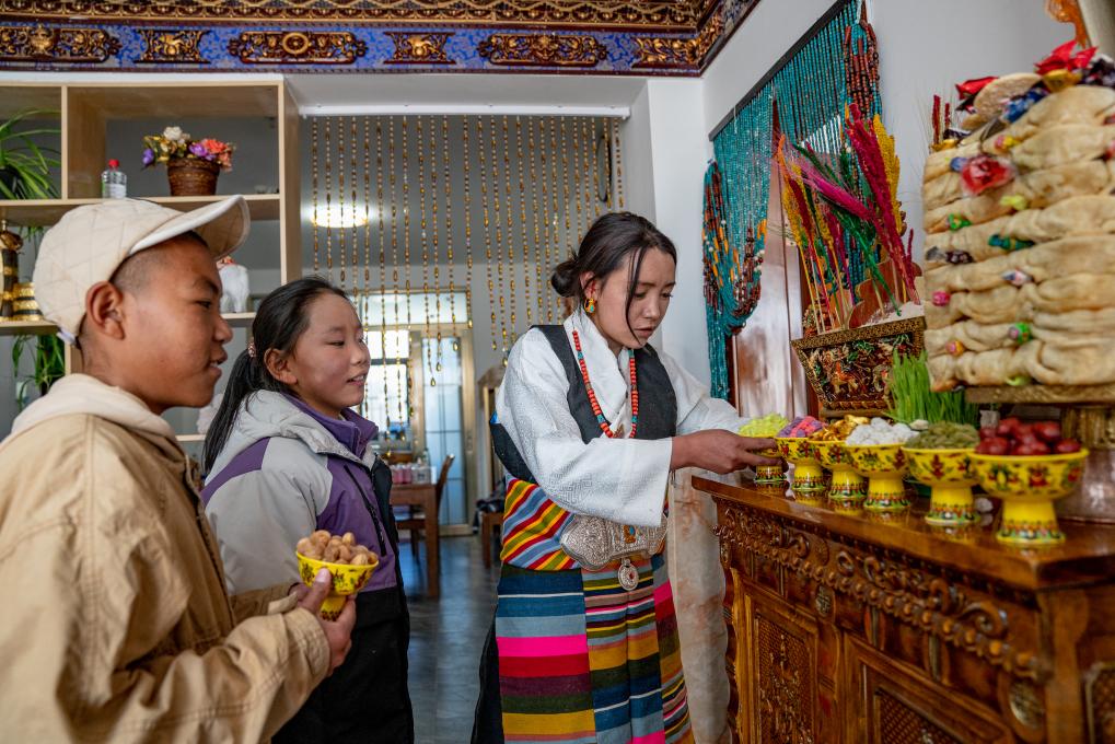 1月8日,愛心媽媽旦增卓瑪和孩子們擺放新年供品。新華社照片,拉薩,2024年1月9日 新華社發(fā)(丁增尼達攝)