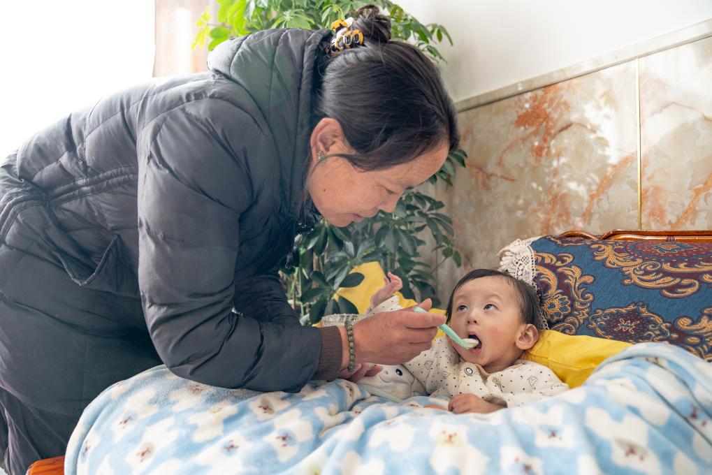1月8日,愛心媽媽巴桑在給一歲半的拉巴扎西喂飯。新華社照片,拉薩,2024年1月9日新華社發(fā)(丁增尼達攝)