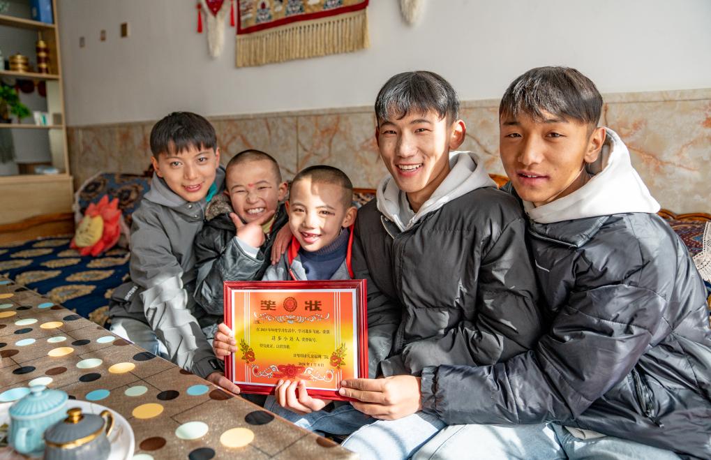 1月8日,“幸福家庭”的孩子們展示獎狀。新華社照片,拉薩,2024年1月9日 新華社發(fā)(丁增尼達攝)