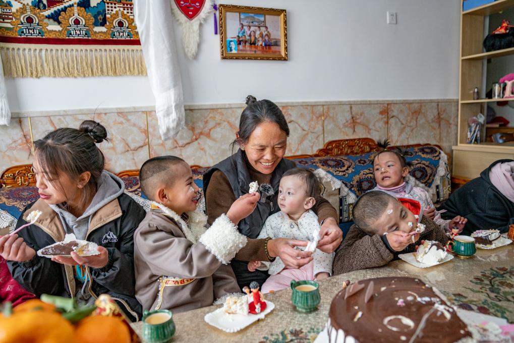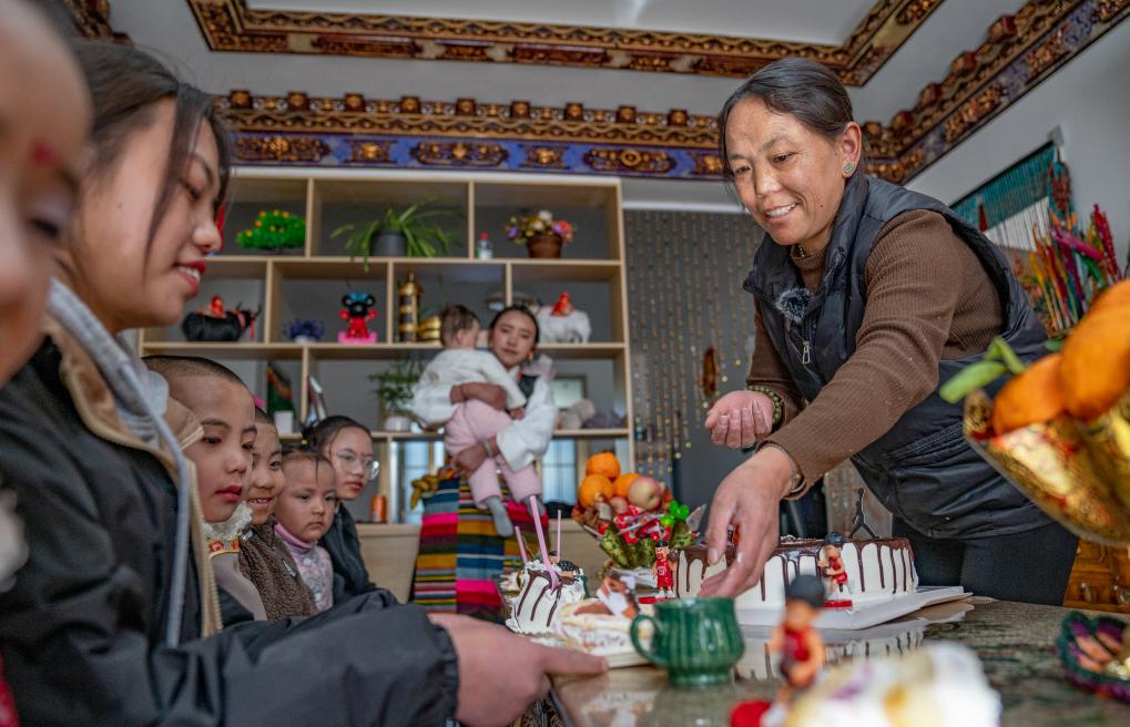 1月8日,愛心媽媽巴桑和孩子們一起吃蛋糕。新華社照片,拉薩,2024年1月9日 新華社發(fā)(丁增尼達攝)