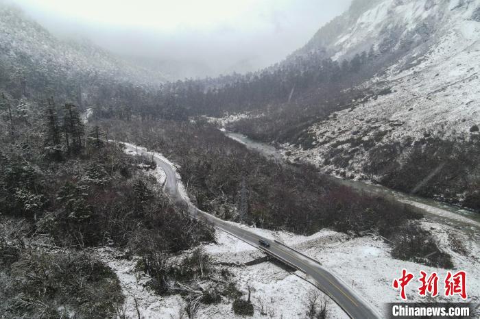 圖為2023年12月18日,大雪中的西藏墨脫扎墨公路。(無人機畫面)中新社記者 江飛波 攝