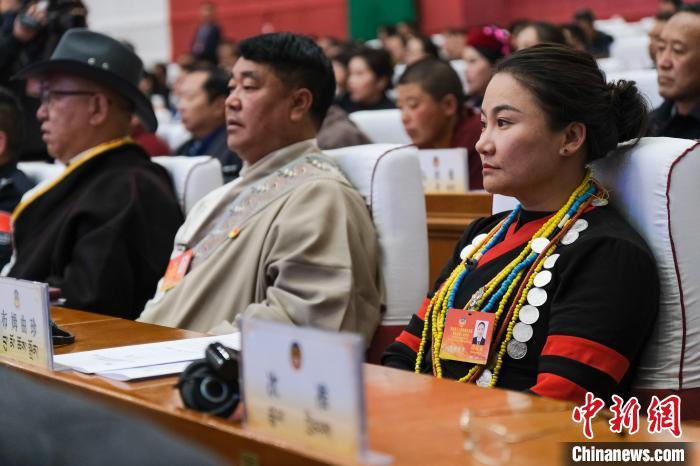 1月9日,西藏少數(shù)民族界政協(xié)委員、墨脫縣達木珞巴民族鄉(xiāng)鄉(xiāng)長布姆曲珍(右一)在西藏自治區(qū)兩會現(xiàn)場。中新社記者 江飛波 攝