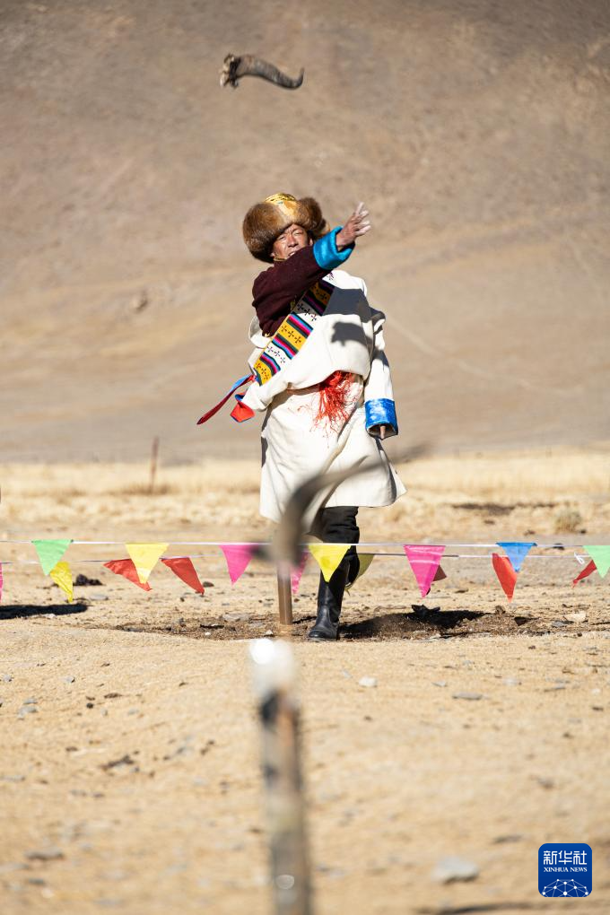 思古龍村的一位村民在投擲牛角(1月13日攝)。新華社發(fā)(丁增尼達 攝)