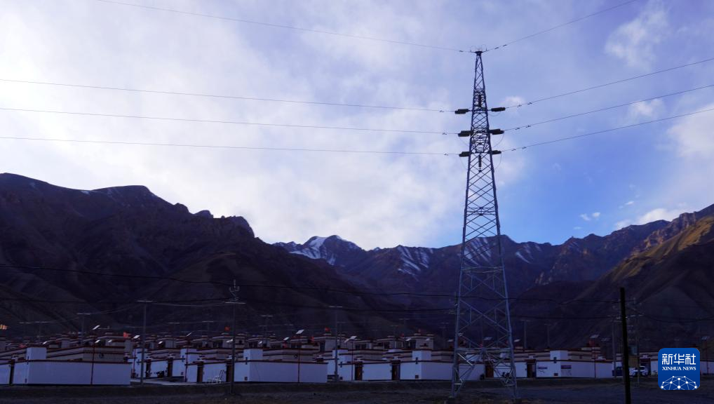 這是楚魯松杰鄉(xiāng)瑪尼唐卡搬遷點的新房和電力鐵塔(2024年1月12日攝)。新華社記者 陳尚才 攝
