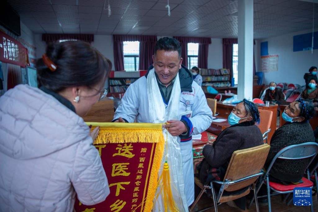 1月27日,拉布村駐村工作隊(duì)向義診隊(duì)贈(zèng)送錦旗。新華社記者 劉文博攝