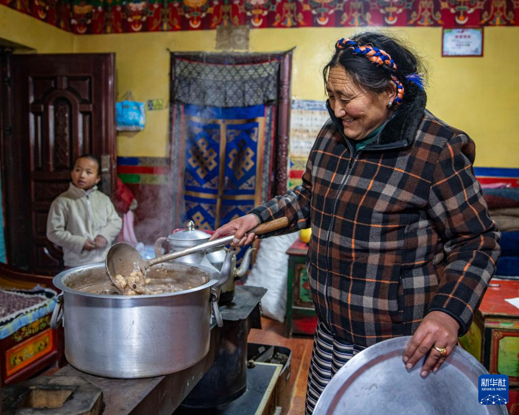 在位于西藏拉薩市當(dāng)雄縣公塘鄉(xiāng)甲根村的家中,斯曲旺姆的兒子索朗羅達(dá)為母親端上“古突”(2月8日攝)。新華社記者 孫非 攝