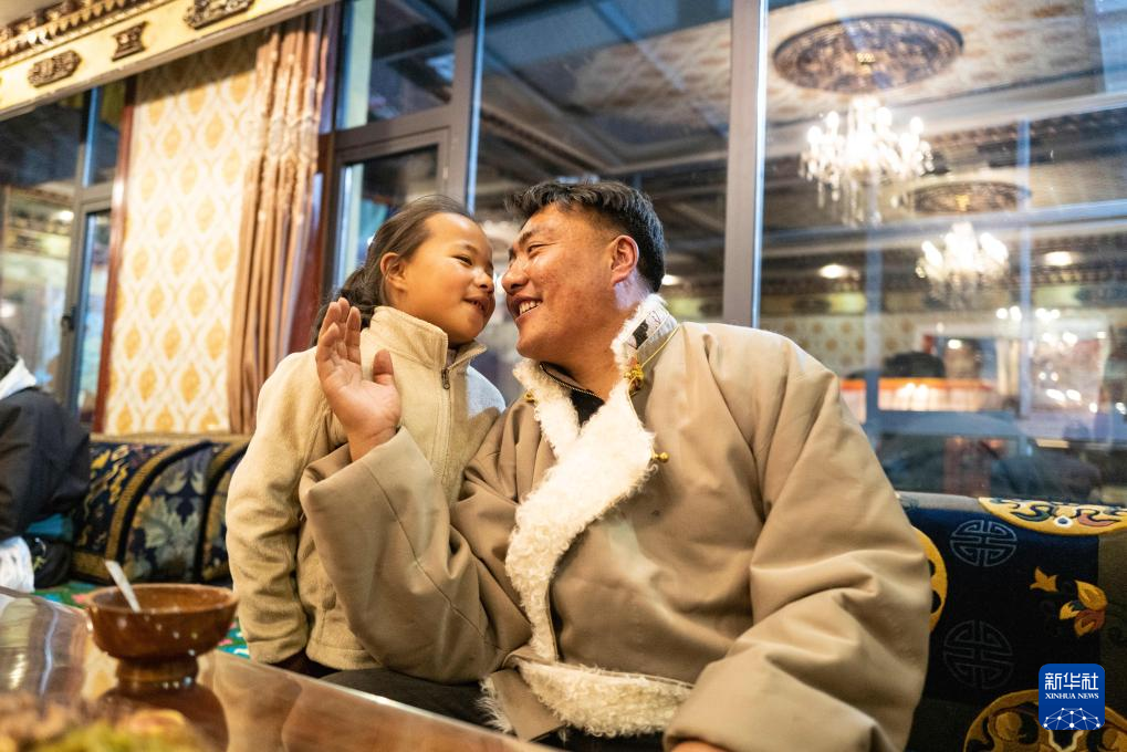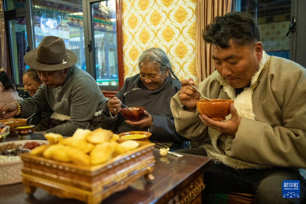 在西藏拉薩市當(dāng)雄縣公塘鄉(xiāng)甲根村,整個(gè)村子沉浸在節(jié)日氣氛中。村里的斯曲旺姆老人家四世同堂,房屋寬敞明亮。手里捧著盛滿“古突”的木碗,斯曲旺姆老人希望這樣的幸福能長長久久。