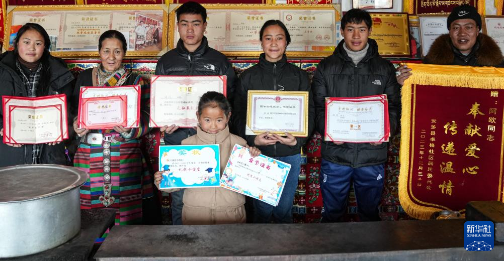 阿歐一家人展示家里人獲得的各種獎(jiǎng)狀、證書(1月31日攝)。新華社記者 晉美多吉 攝