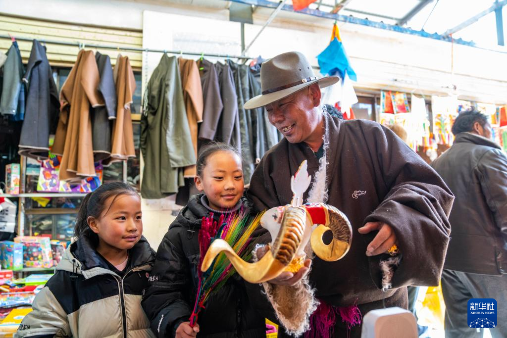 在當(dāng)雄縣的年貨市場,索朗羅達(dá)(右)和孫女們正在選購羊頭(2月3日攝)。新華社記者 孫非 攝