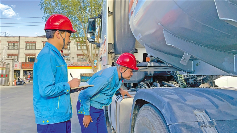 中國石油運(yùn)輸西藏分公司工作人員在對(duì)油罐車輛進(jìn)行安全檢查。記者 次仁平措 通訊員 格桑旦增 攝