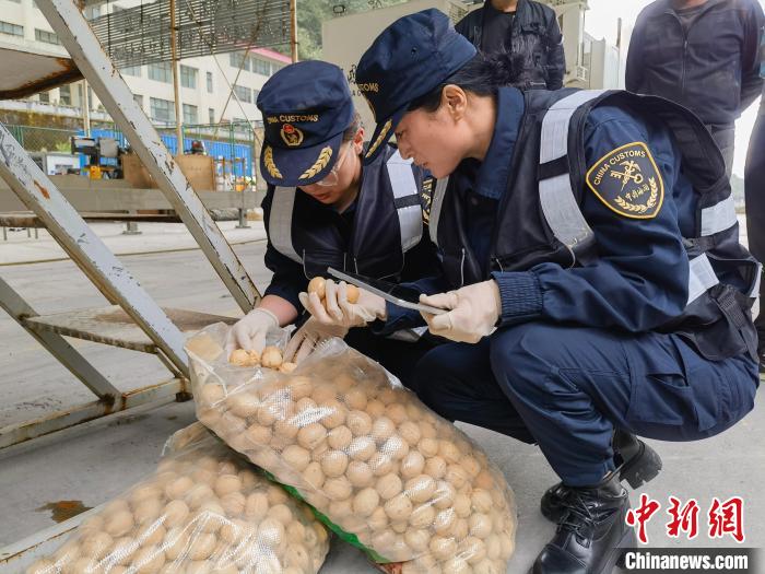 圖為2023年,拉薩海關(guān)所屬聶拉木海關(guān)關(guān)員監(jiān)管驗放出口農(nóng)產(chǎn)品。資料圖 拉薩海關(guān)供圖