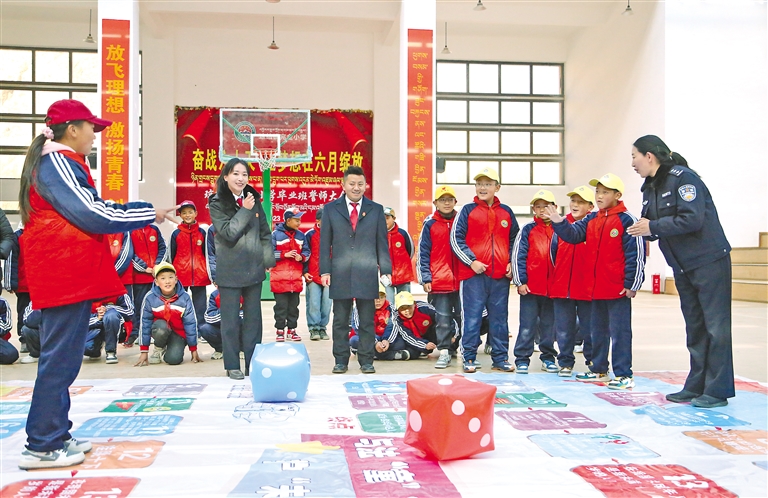 圖為3月5日,瓊結(jié)縣人民法院干警們在瓊結(jié)鎮(zhèn)完全小學(xué)用游戲方式開展“法治第一課”活動。倫珠澤仁 記者 洛桑 攝