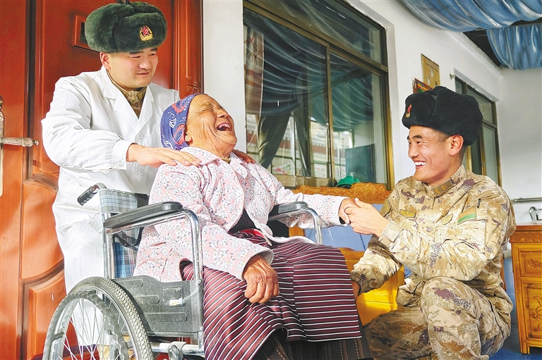 圖為3月5日,阿里軍分區(qū)某邊防團(tuán)官兵走進(jìn)養(yǎng)老院、駐地社區(qū),為老人們提供按摩、理發(fā)等志愿服務(wù)。劉曉東 記者 次仁平措 攝