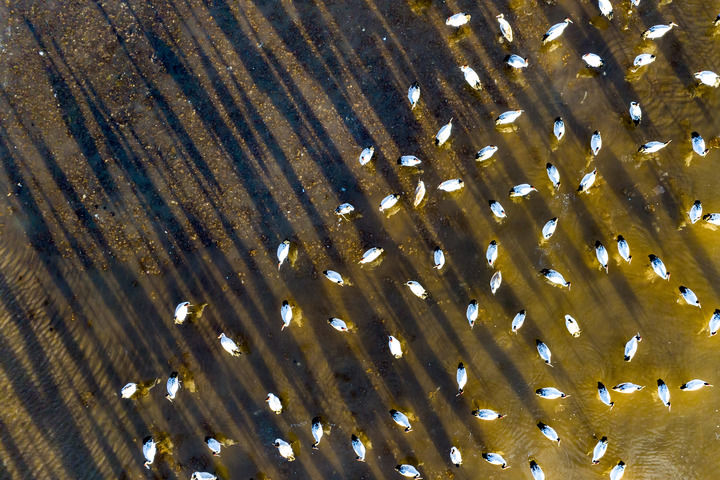這是2023年12月5日清晨在拉薩市林周縣虎頭山水庫拍攝的越冬黑頸鶴(無人機照片)。新華社記者 姜帆 攝