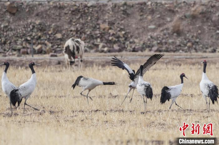 圖為黑頸鶴在林周縣境內(nèi)的農(nóng)田里覓食、嬉戲。貢嘎來(lái)松 攝