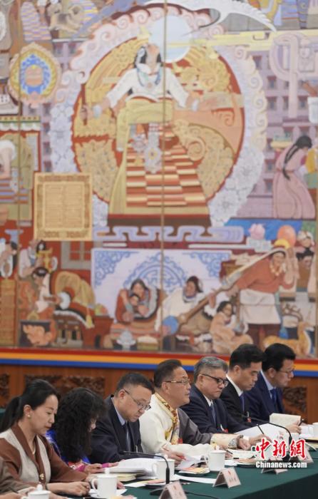 2024年3月6日,出席十四屆全國(guó)人大二次會(huì)議的西藏代表團(tuán)在北京人民大會(huì)堂西藏廳舉行開放團(tuán)組會(huì)議,審議政府工作報(bào)告并回答記者提問。崔楠 攝