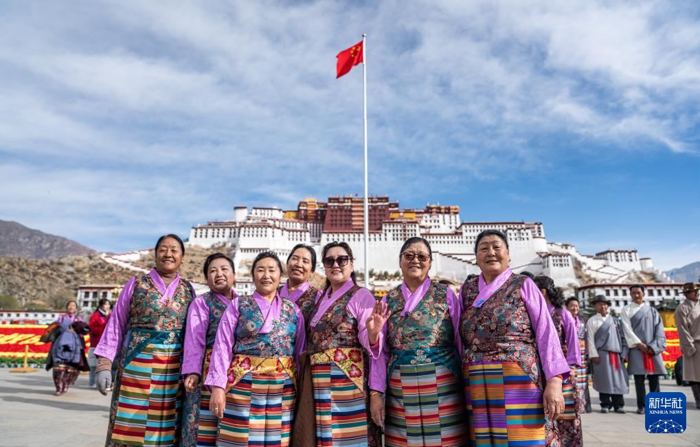 3月28日,人們在布達拉宮廣場參加升旗儀式后合影留念。新華社記者 丁增尼達 攝