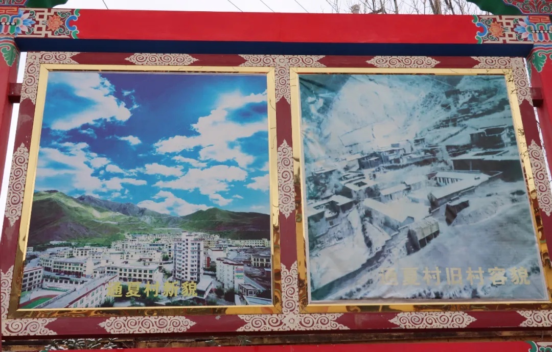 而在通夏村門口,兩幅照片十分顯眼,一幅是通夏村新貌,一幅是舊貌。在舊貌中,低矮的土平房在大雪積壓下,東零西落地散布在起起伏伏的坡面上,冰雪覆蓋的泥濘小道幾乎無法通行?!斑@樣的土坯房我和先輩們住了幾十年,更早以前,甚至都沒有房子,放牧到哪里,帳篷就支到哪里。”今年83歲的村民達(dá)瓦扎巴指著老照片說。而在一旁新貌圖中,蔚藍(lán)的天空下一幢幢藏式小樓整齊林立,寬敞的水泥路通家達(dá)戶,一派欣欣向榮的景象……