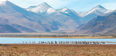 黑頸鶴和其他動(dòng)物正在西藏日喀則市拉孜縣曲瑪鄉(xiāng)的草地里覓食。瓊達(dá)卓嘎、益西旦增攝