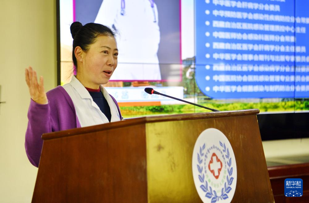 4月3日,北京協(xié)和醫(yī)院主任醫(yī)師龍笑在西藏自治區(qū)人民醫(yī)院做學術(shù)報告。新華社記者 張汝鋒 攝