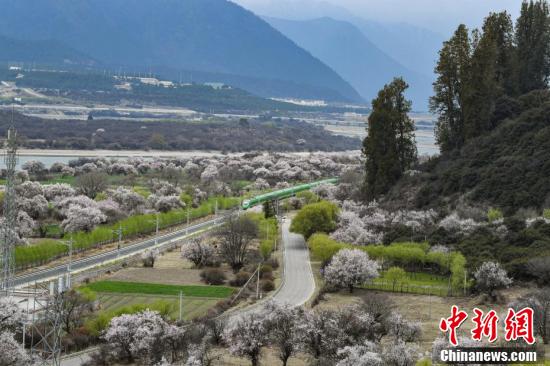 復興號動車組不僅是一種便捷的交通方式,更成為了一種獨特的旅游體驗,讓游客能夠近距離欣賞到西藏林芝春季獨特的自然美景。圖為穿梭在桃花林中的拉林鐵路高原復興號。