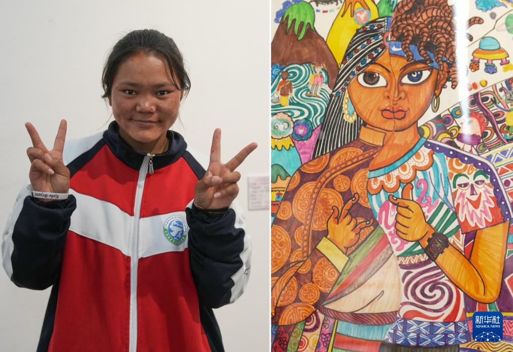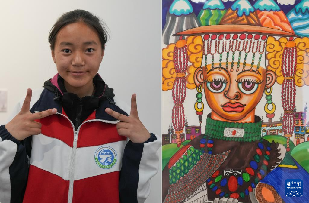4月19日拍攝的拉薩市特殊教育學(xué)校14歲的聽障學(xué)生貢覺(jué)央吉和她的作品《阿里服飾》(拼版照片)。新華社記者 晉美多吉 攝