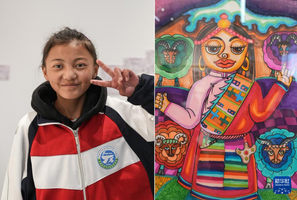 4月19日拍攝的拉薩市特殊教育學(xué)校13歲的聽障學(xué)生白瑪次仁和她的作品《放羊的小卓瑪》(拼版照片)。新華社記者 晉美多吉 攝