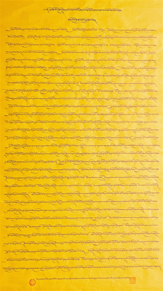 藏文書法一等獎作品《在黨的民族政策光輝照耀下各族人民繁榮發(fā)展》。作者 索朗歐珠