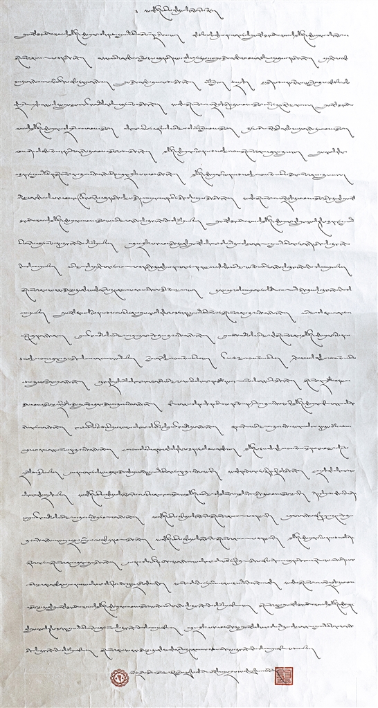 藏文書法二等獎作品《黨的二十大精神要點》。作者 扎桑