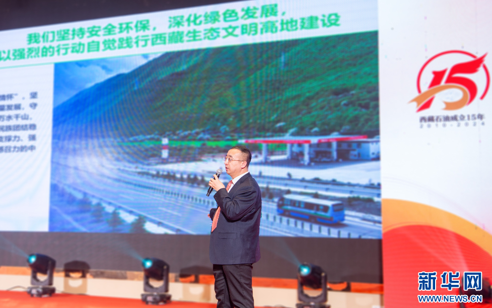 4月28日,中國石化西藏石油分公司代表、黨委書記施長春在活動現(xiàn)場發(fā)布中國石化西藏石油社會責任報告。新華網(wǎng) 旦增努布 攝