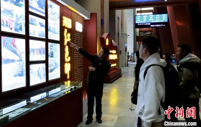 拉薩車站客運運轉車間主任候占元帶領候車旅客參觀車站的愛國主義教育基地文化長廊。旅客們在這里聆聽了青藏鐵路發(fā)展史、青藏鐵路人的奮斗故事。