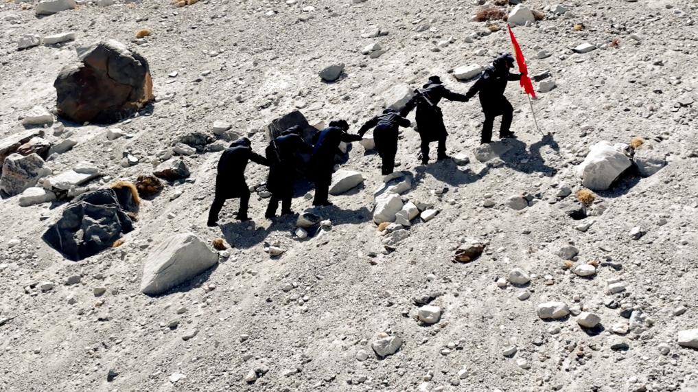 又經(jīng)過4個小時的跋涉,巡邏隊最終抵達本次巡邏的終點。每次到巡邏任務結束,都會在這里留下一個小石頭,并許下一個愿望,祝祖國繁榮昌盛,也祝自己心想事成。