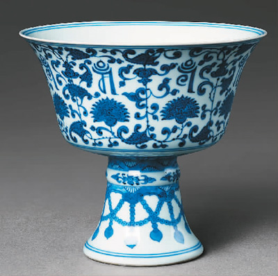 清代青花纏枝蓮?fù)需笪募y高足供碗。中國大運河博物館供圖