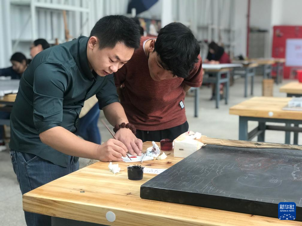 2018年,仁青郎加(右)正跟老師學習漆畫技法。新華社發(fā)