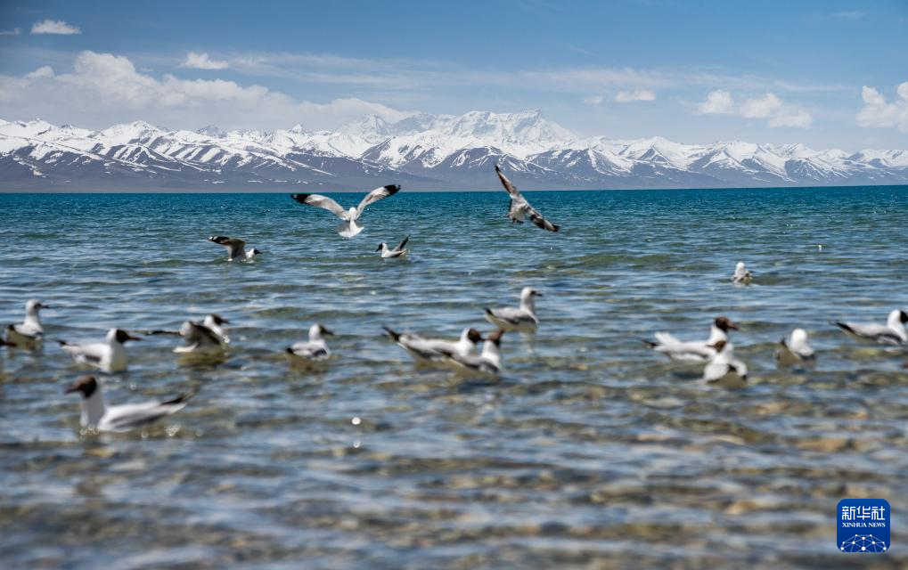 一群棕頭鷗在冰雪消融的納木錯湖面停留(5月19日攝)。新華社記者 丁增尼達 攝