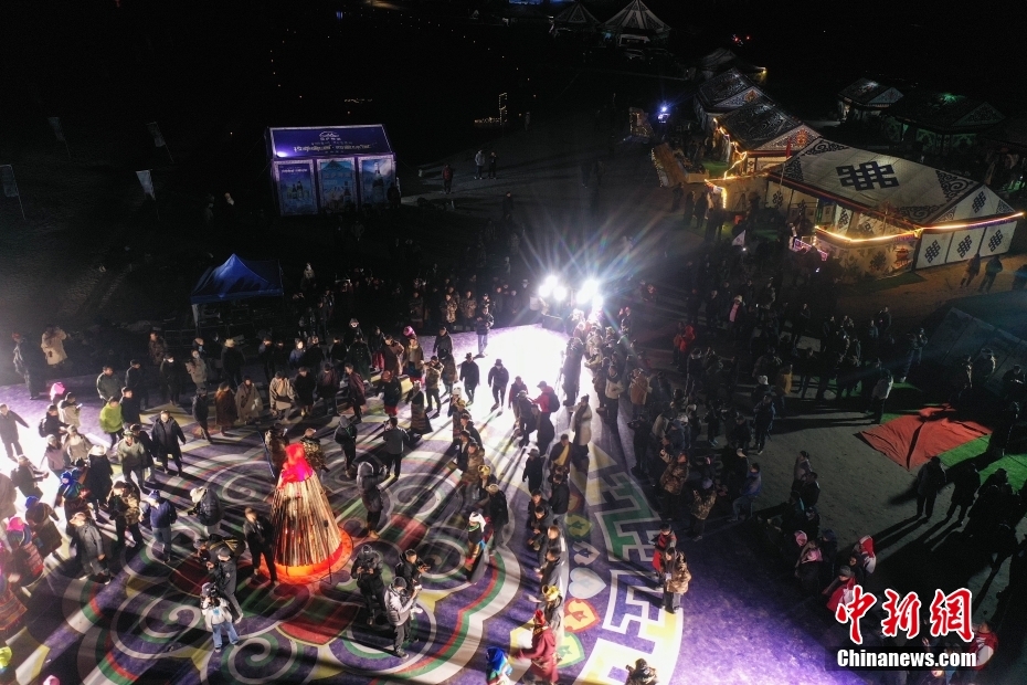 5月18日晚,西藏拉薩市當(dāng)雄縣納木錯湖畔,當(dāng)?shù)啬撩駧в慰腕w驗(yàn)篝火鍋莊舞。納木錯,被譽(yù)為“天湖”,吸引著大量游客前來觀光。圖為篝火鍋莊舞晚會上的文藝演出。