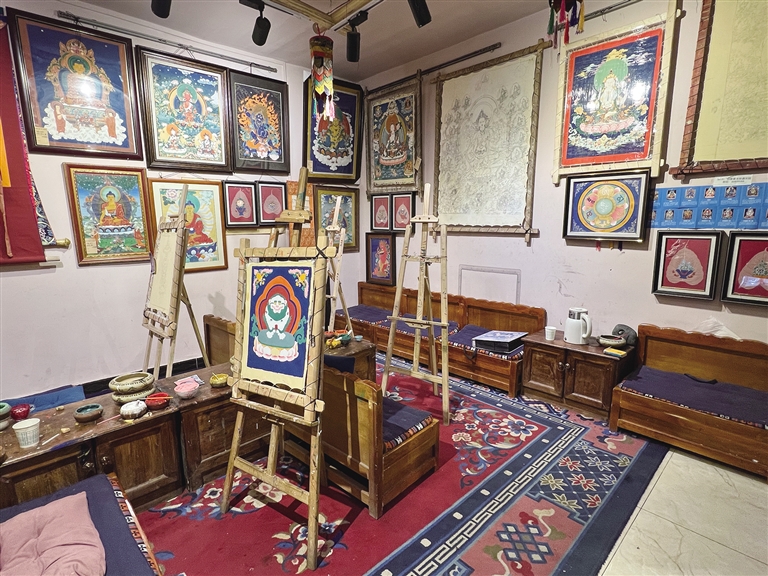 唐卡非遺文創(chuàng)體驗館中的唐卡畫室。