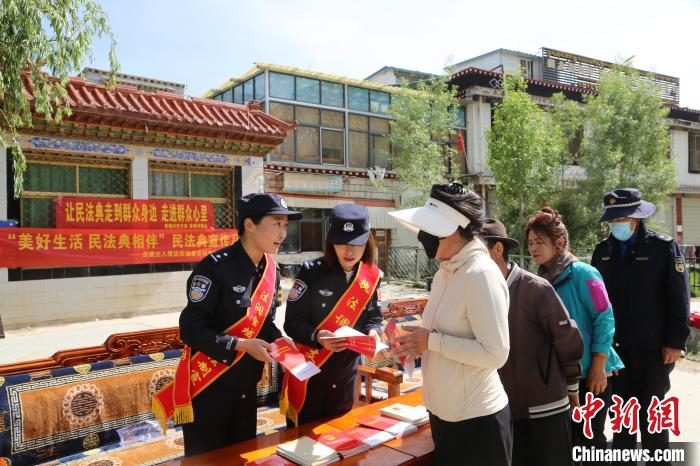 活動現(xiàn)場,西藏邊檢總站執(zhí)法調查支隊民警通過懸掛橫幅、發(fā)放宣傳資料、現(xiàn)場答疑等方式,向民眾普及《民法典》知識。