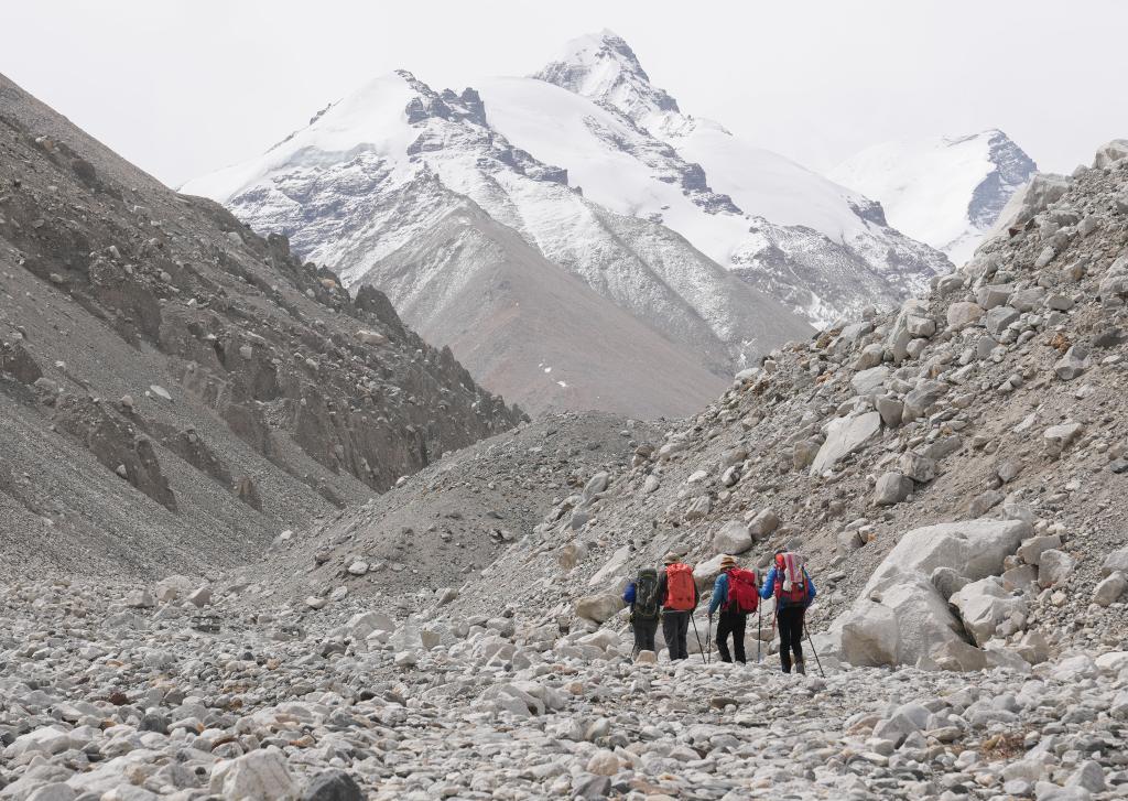 德諾埃爾兄弟和隊(duì)友們正在離開(kāi)珠峰登山大本營(yíng)前往更高海拔的營(yíng)地(5月18日攝)。新華社記者 丁汀 攝