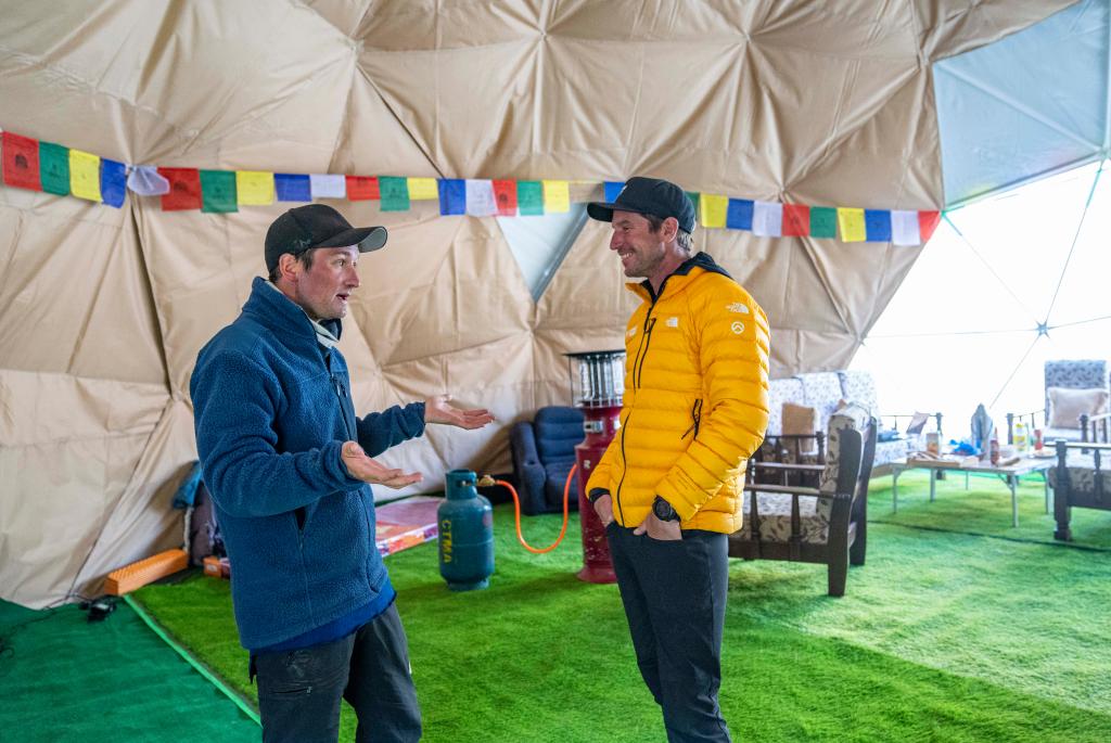 在珠峰登山大本營(yíng),盧卡斯·富滕巴赫(右)正在和隊(duì)友哈康·埃蘭森聊天交流(5月24日攝)。新華社記者 孫非 攝
