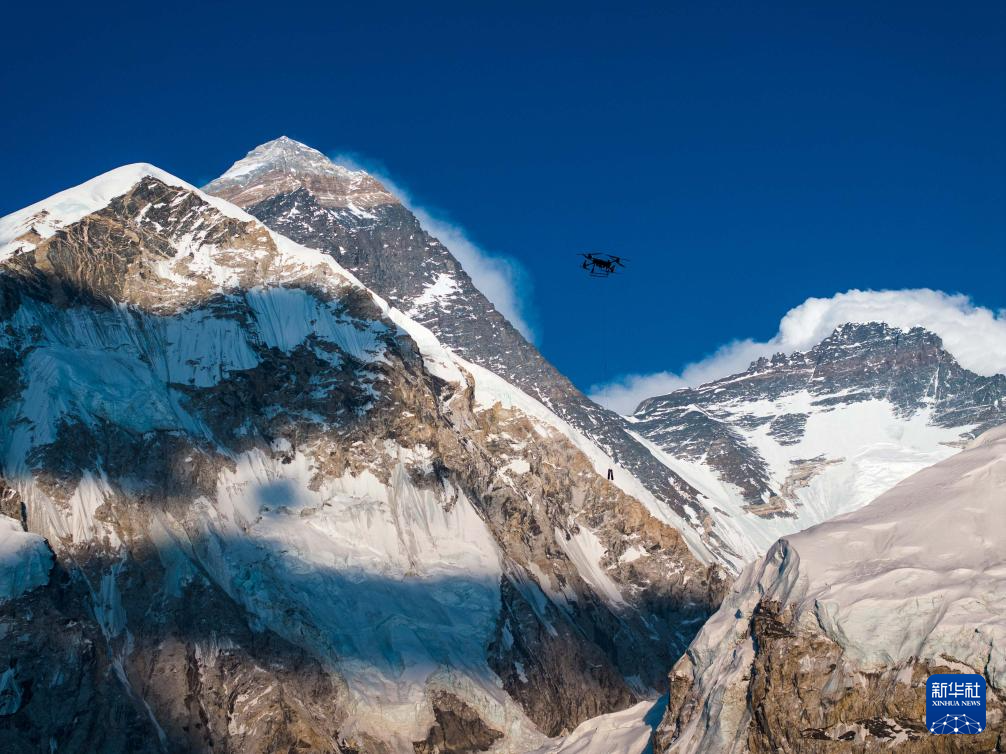 4月30日,大疆運載無人機在珠穆朗瑪峰尼泊爾一側(cè)進行物資運輸測試(視頻截圖)。新華社發(fā)