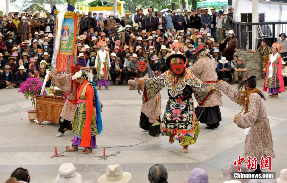 6月12日,藏戲藝人在拉薩市宗角祿康公園表演。從6月9日起,拉薩2024年“藏戲演出季”啟幕。布達(dá)拉宮腳下的宗角祿康公園,5支民間藏戲團(tuán)隊(duì)表演的傳統(tǒng)藏戲劇目,吸引當(dāng)?shù)孛癖姾陀慰颓皝碛^看。李林 攝